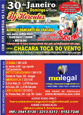 É isso aí rapaziada, mais um almoço dançante com DJ Hercules na Chácara Toca dos Ventos, informações no flyer.